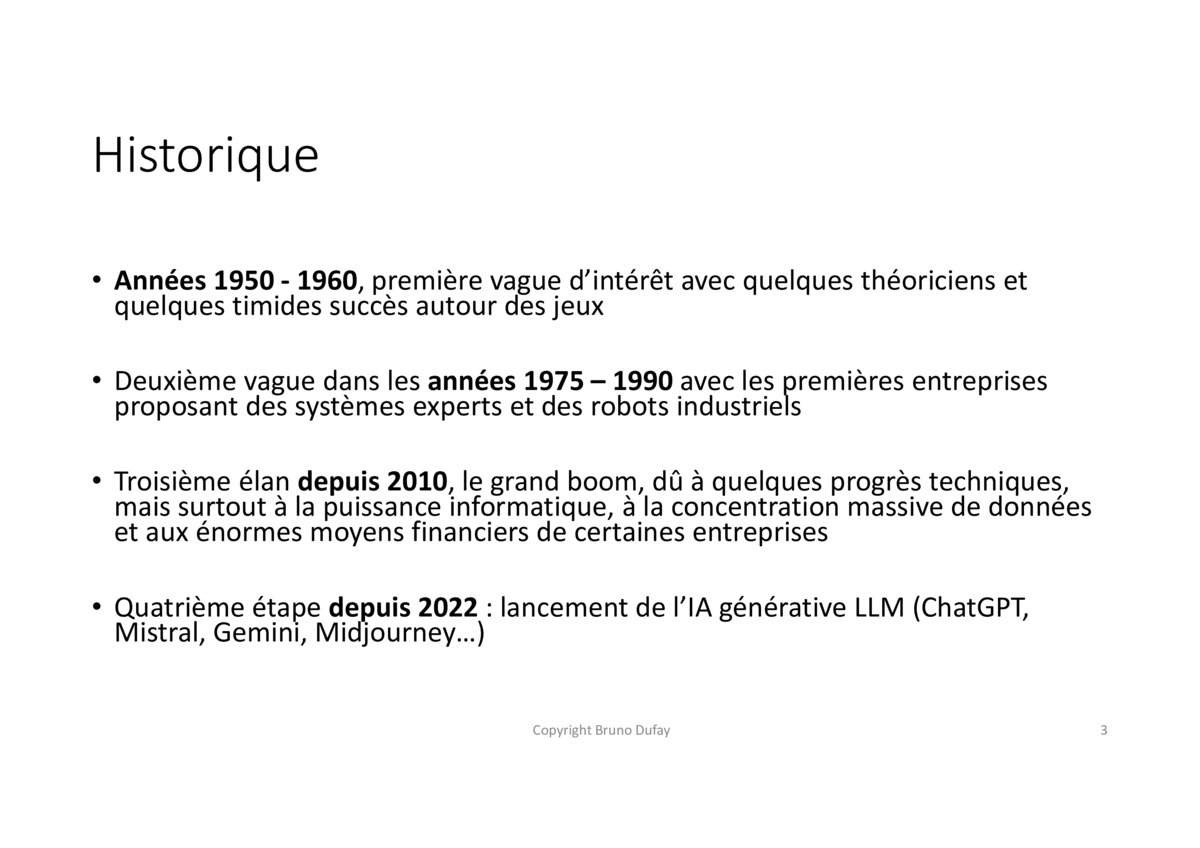 Premier constat : l’IA n’est pas si récente. Depuis les années 50, avec des pionniers comme John McCarthy, elle a mis des décennies à se développer avant d’exploser dans le grand public ces dernières années.